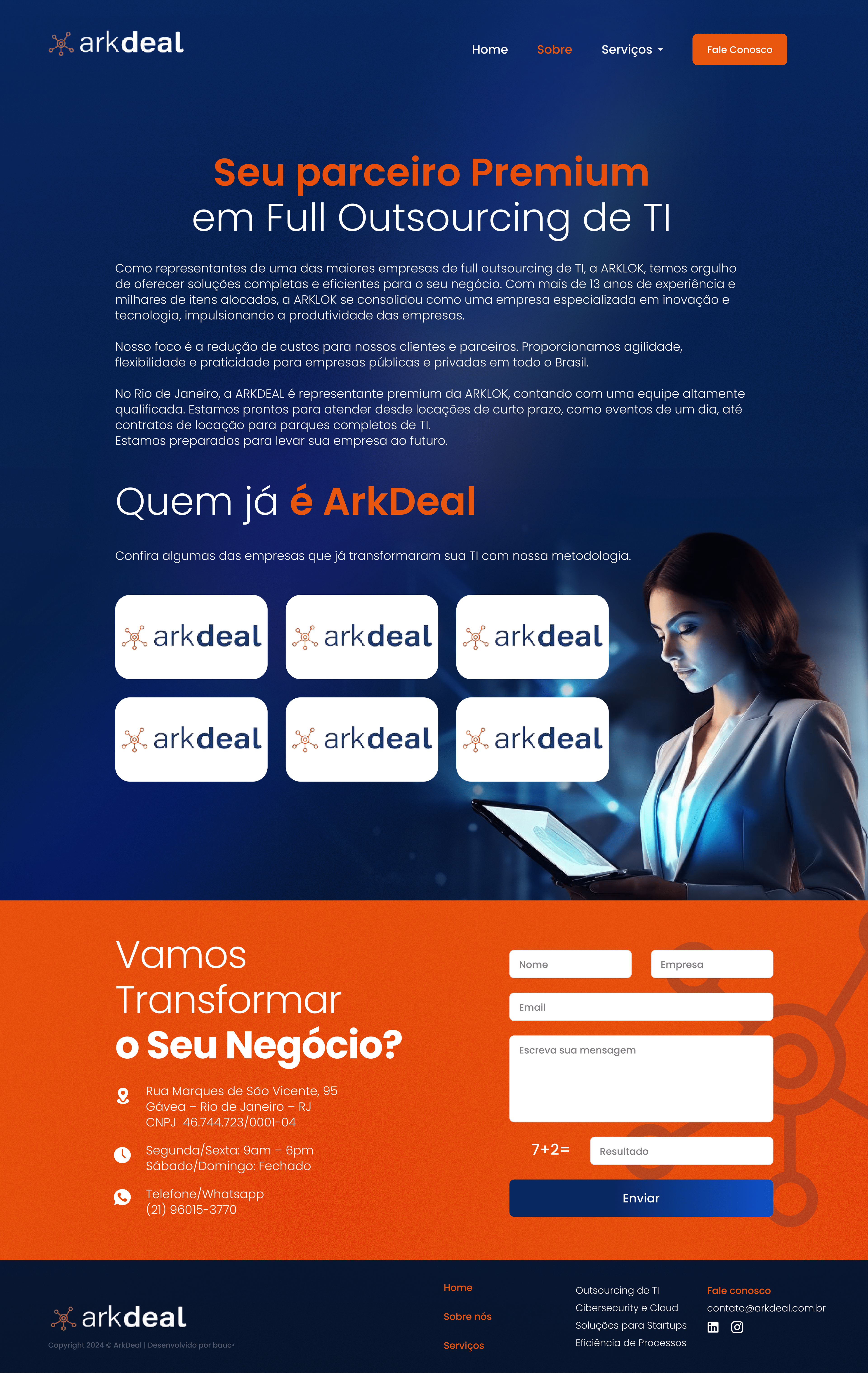 O projeto do novo site da ArkDeal surgiu da necessidade de substituir um layout genérico de WordPress por uma presença digital com mais personalidade, clareza e fluidez. O objetivo era construir uma experiência visual moderna, organizada e fácil de ler, sem perder funcionalidade.